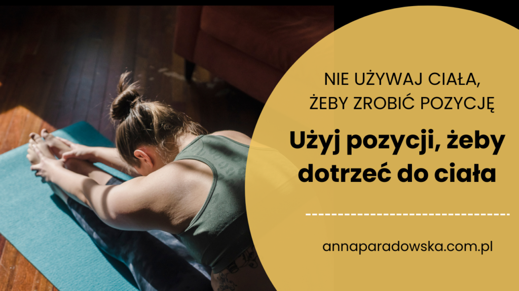 Przy trudnościach zaczyna się kierowanie uwagi do wewnątrz i sprawdzanie, co jest takiego we mnie, że nie mogę lub boję się wykonać daną asanę. Powoli, krok po kroku, rozpracowujesz tę asanę i sprawdzasz Twoją reakcję Ciała i Psychiki na tę pozycję. Tam znajdujesz wiele cennych informacji na swój temat. Ja tak rozpracowywałam pozycję świecy i halasany ( pług). Świecę zrobiłam dopiero po 8 latach praktyki! ??Przerzucenie nóg za głowę w halasanie budziło we mnie straszną grozę. Powoli, z dużą uważnością zaczęłam najpierw zarzucać nogi na krzesło i odkryłam, że boję się ruchu zbliżania brody do mostka, co ma miejsce w tej pozycji. To rozluźnia gardło. Moje gardło było mocno zaciśnięte, chowałam tam część mojej traumy – niewypowiedziane słowa, które tak bardzo pragnęłam wypowiedzieć, ale nie wolno mi było przez wiele lat. Sama jako dziecko sobie zakazałam. Wielu z nas coś dusi w swoim gardle.